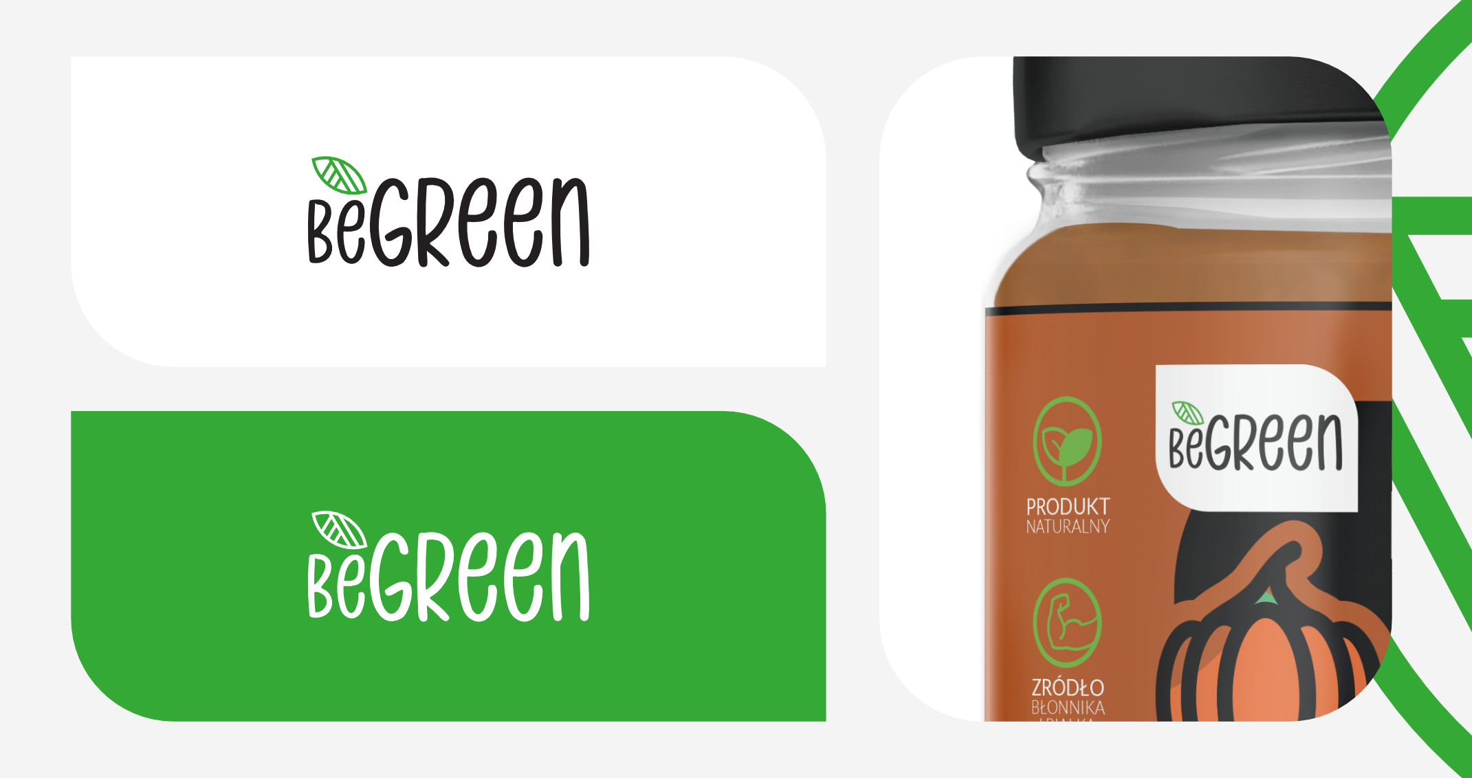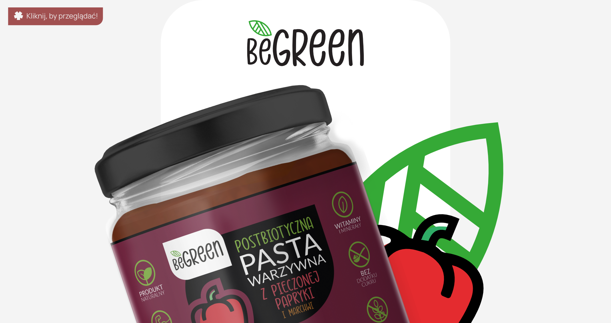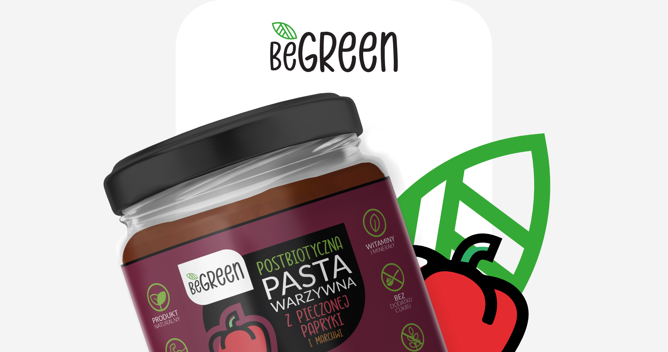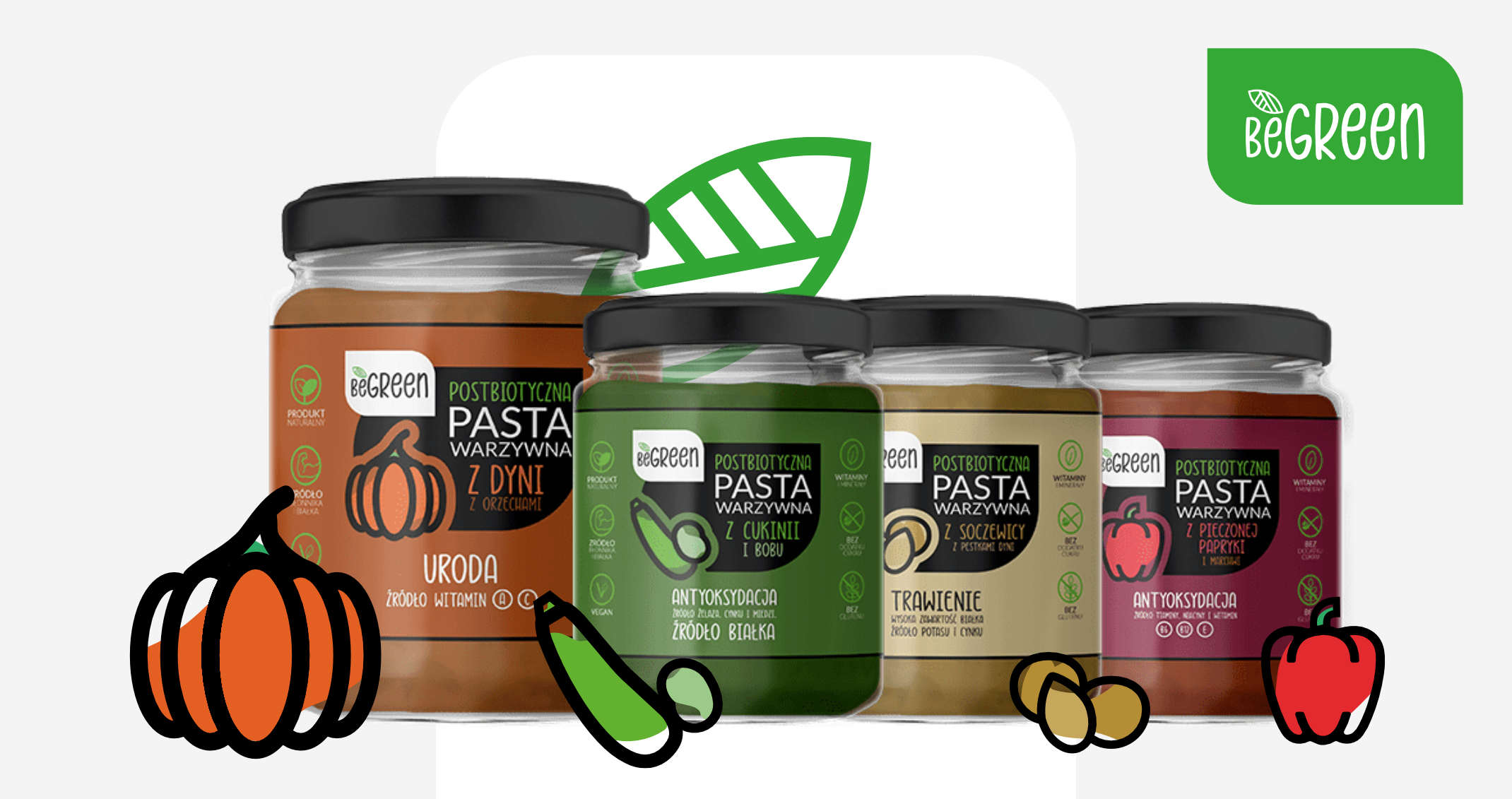 Identyfikacja i system opakowań stworzony na potrzeby projektu "BeGreen", czyli postbiotycznych past warzywnych na rynek ogólnoświatowy.