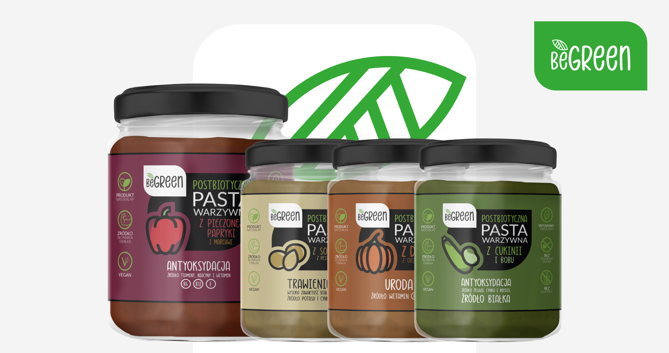 Identyfikacja wizualna i system opakowań dla marki BeGreen - linii postbiotycznych past warzywnych, kierowanej na rynek globalny.
